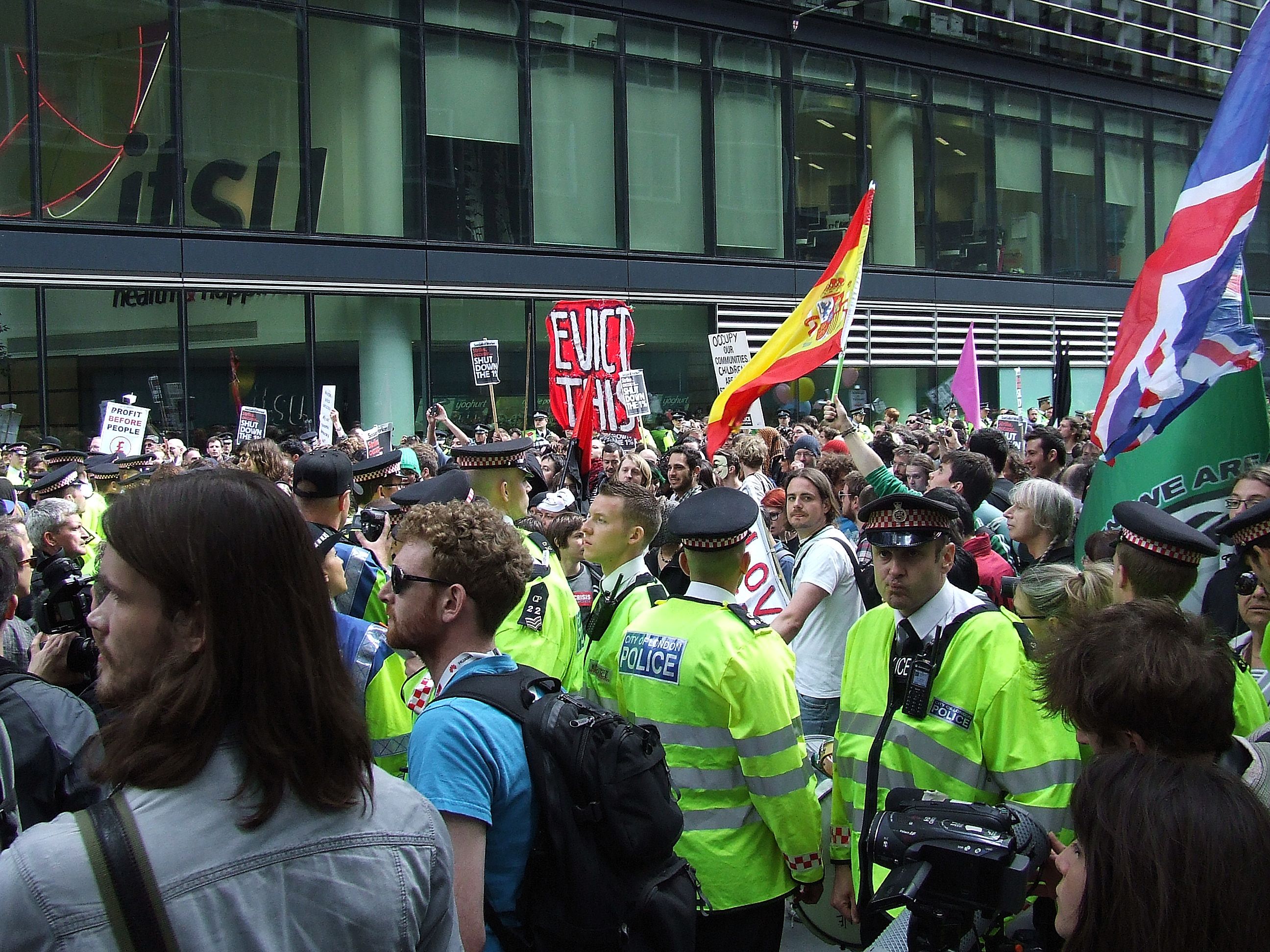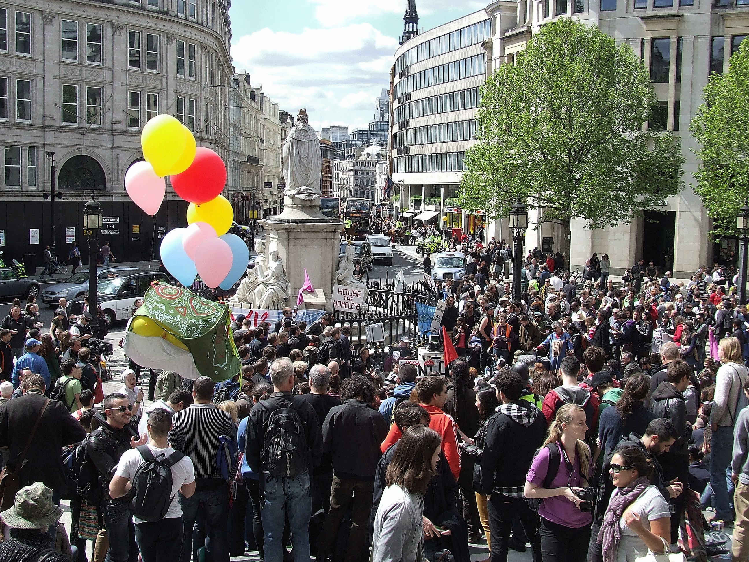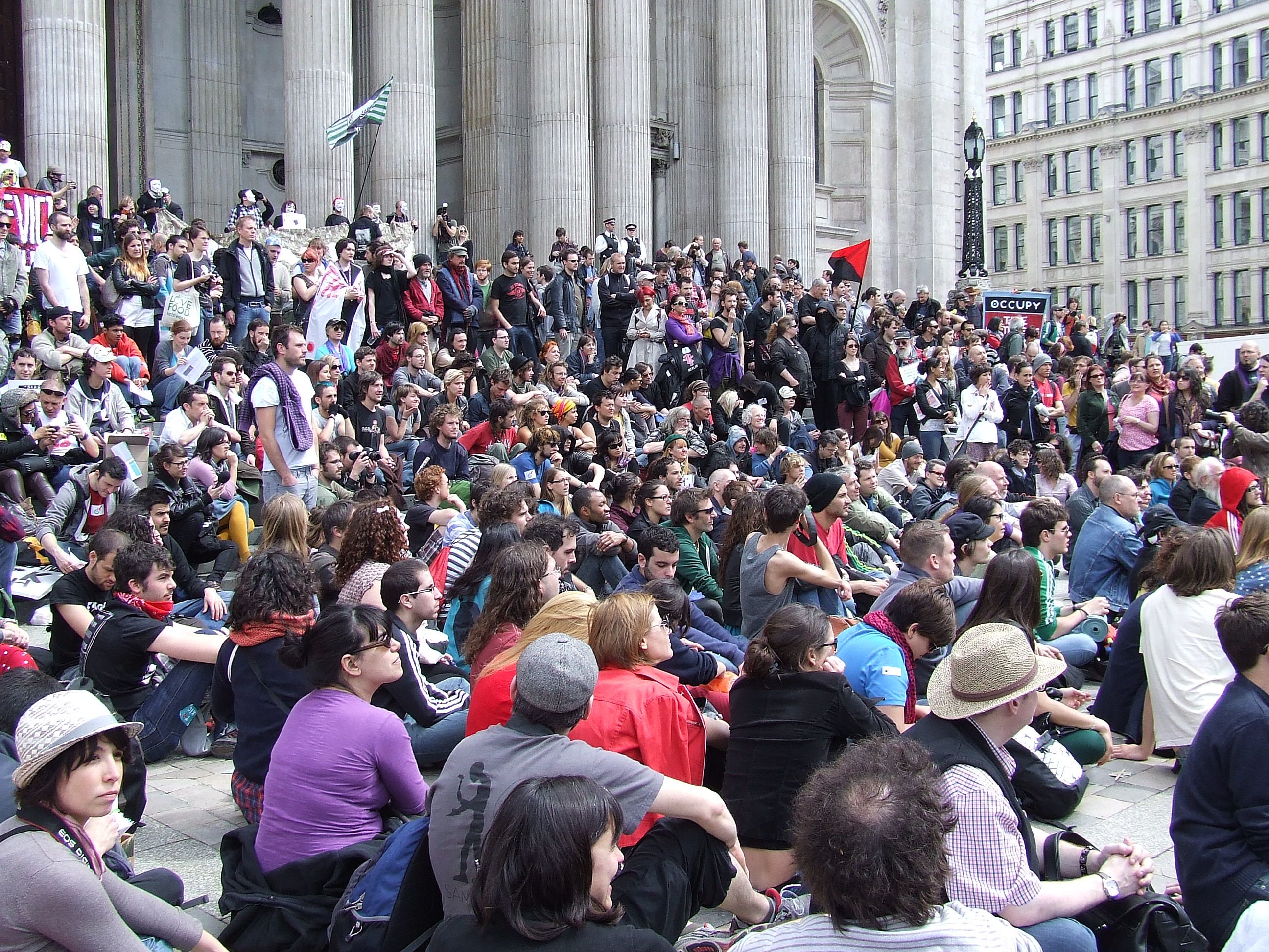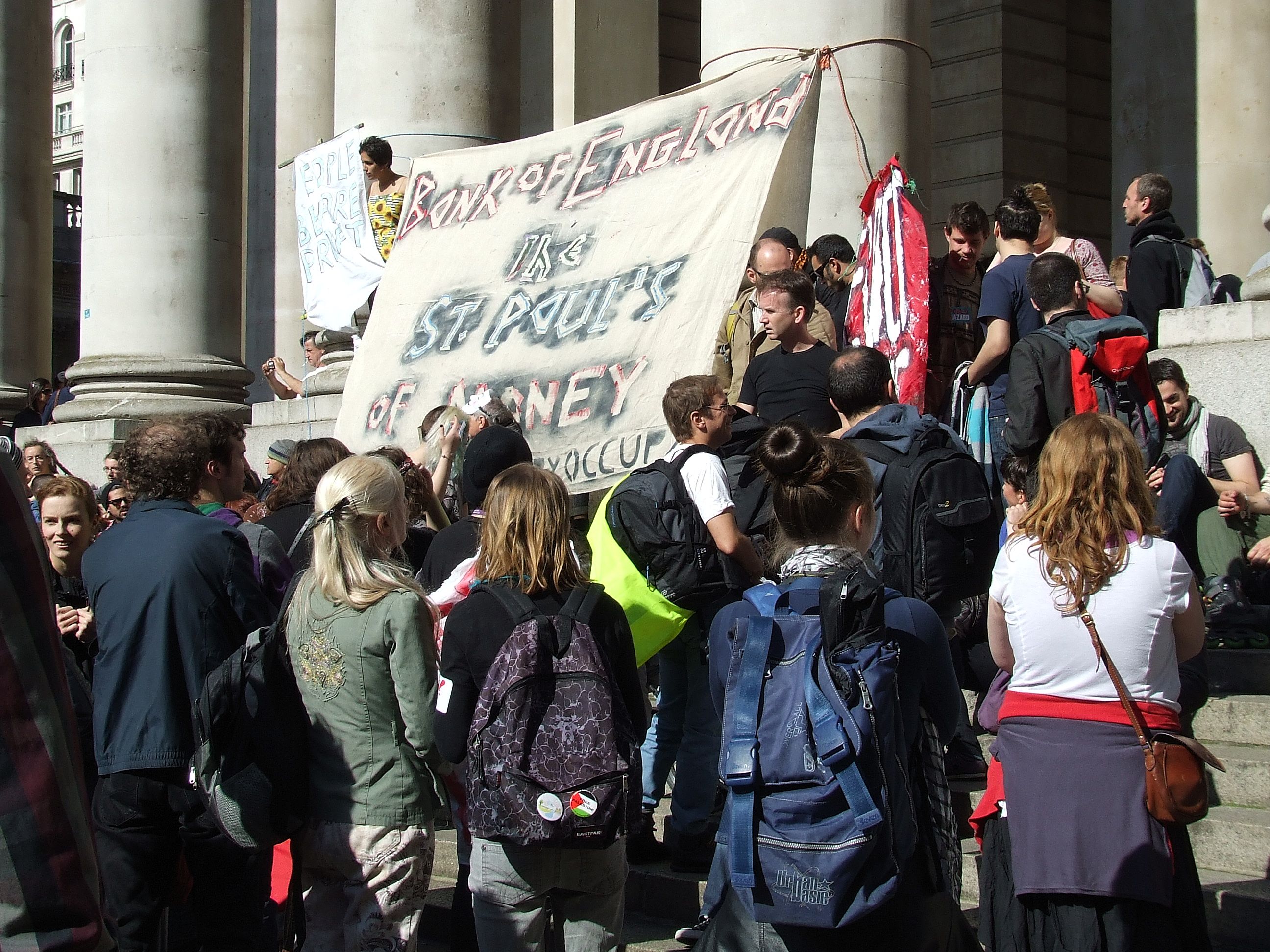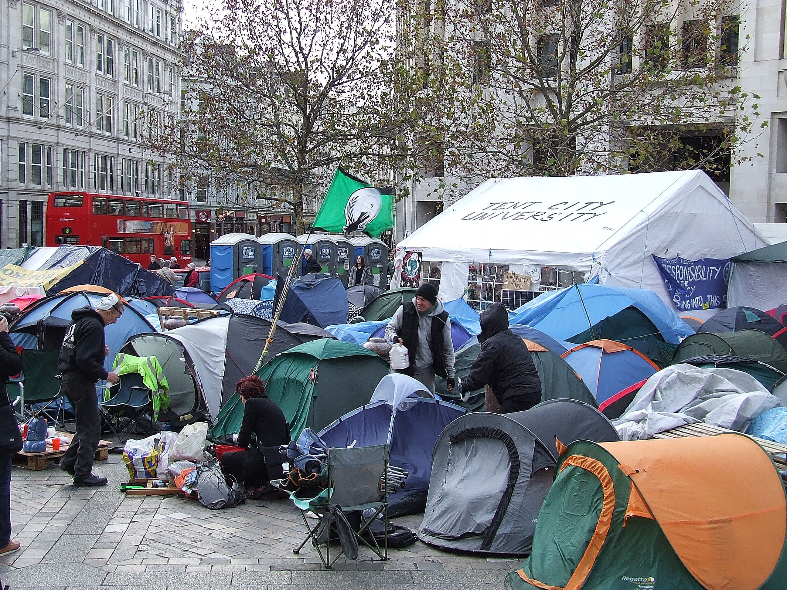 którym nie udało się powstrzymać protestujących przed rozstawieniem niewielkiego miasteczka namiotowego i odbyciem zgromadzenia ogólnego przed siedzibą, jak głosił jeden z transparentów, "Katedry Św. Pawła pieniądza" [