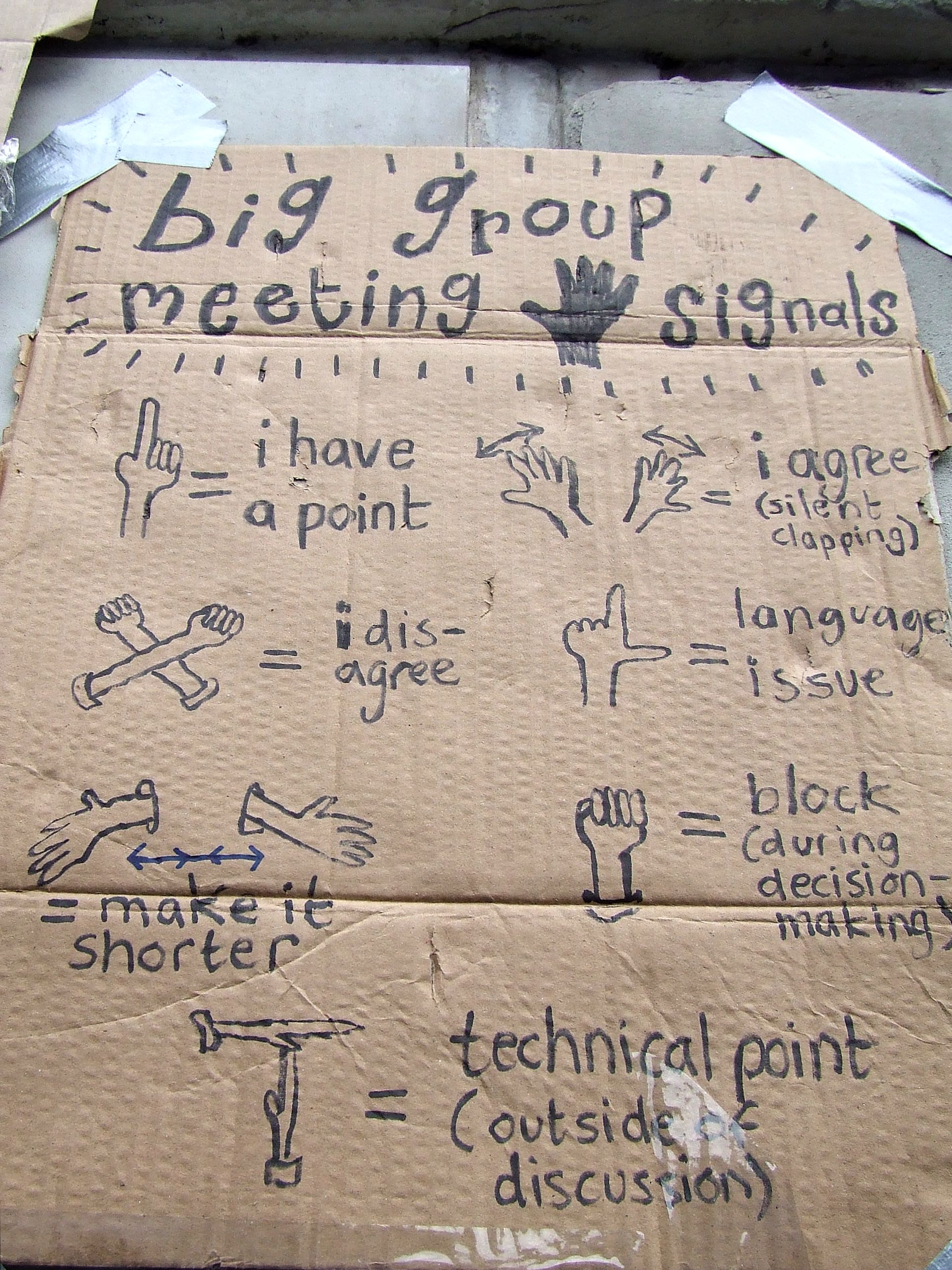 umożliwiające nie tylko sprawne prowadzenie dyskusji, ale też nieprzerwane wyrażanie emocji przez uczestników grupy w sposób przekazujący to mówcy, ale nie zagłuszający go. W praktyce pozwoliło to na odformalizowanie funkcjonowania regularnego Zgromadzenia Generalnego ruchu, podczas którego najważniejsze decyzje podejmowało kilkadziesiąt do kilkuset osób. [