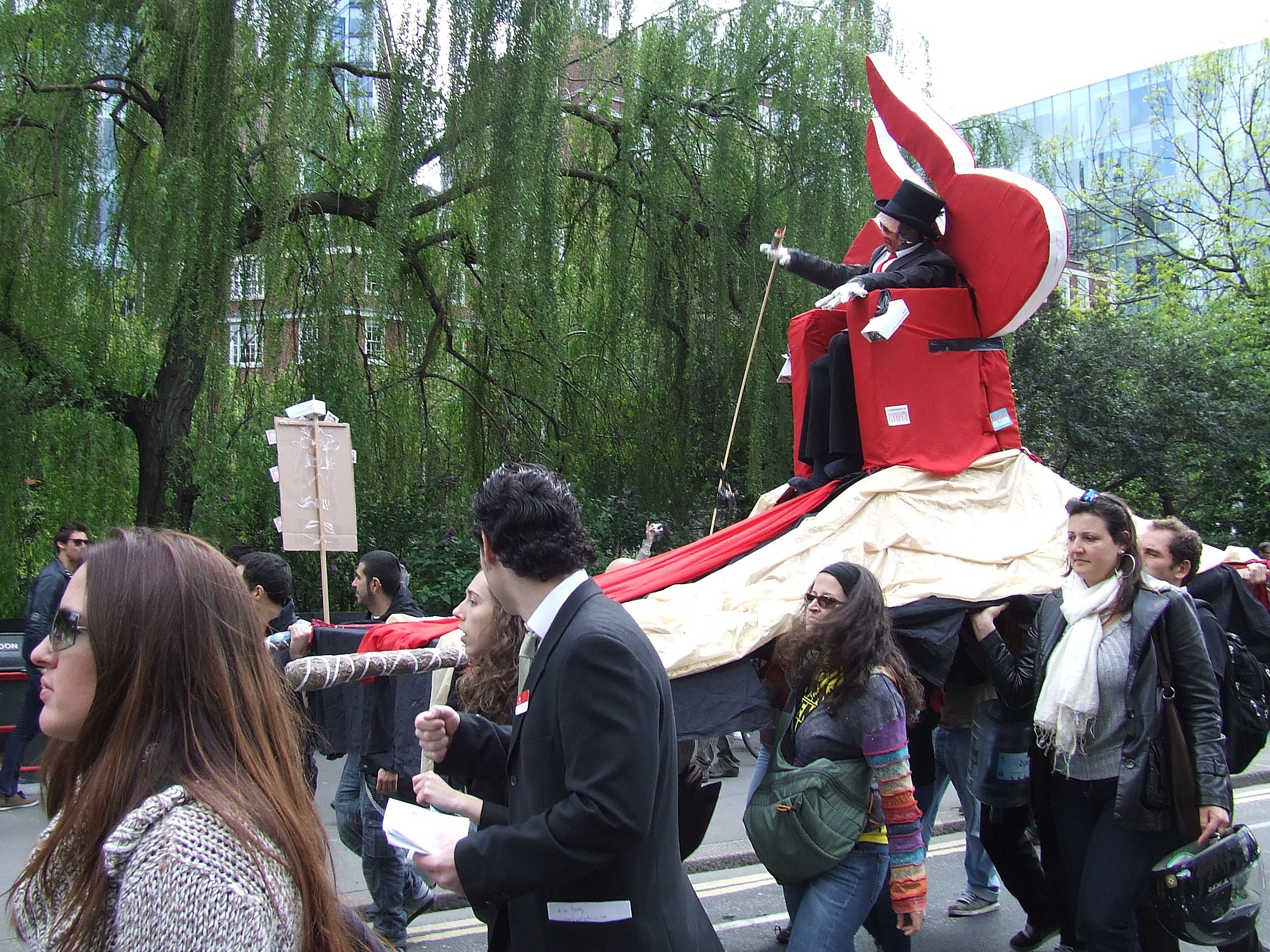 pod hasłem "Spotkaj 1%" przeszła wzdłuż siedzib największych brytyjskich korporacji, niosąc sparodyzowane ich loga [